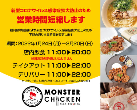 福岡県の要請により新型コロナウイルス感染症拡大防止のため2022年1月24日(月)~2月20日(日)の間、下記の通り営業時間を変更します。